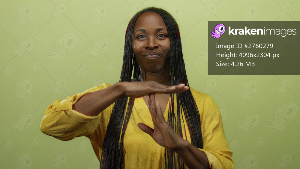 Woman gesturing time with curly hair in yellow top against isolated yellow wall background signifying break pause concept beauty adult female african american.
