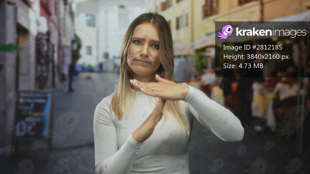 Woman gesturing timeout on outdoor city terrace with bustling restaurant backdrop, showcasing a lively street scene amid urban architecture and social interaction. - Kraken Images