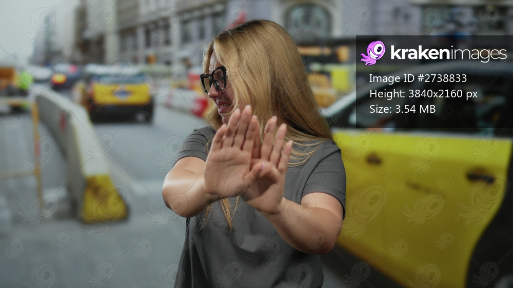 Woman gesturing with uncertainty at construction site surrounded by busy traffic and city buildings