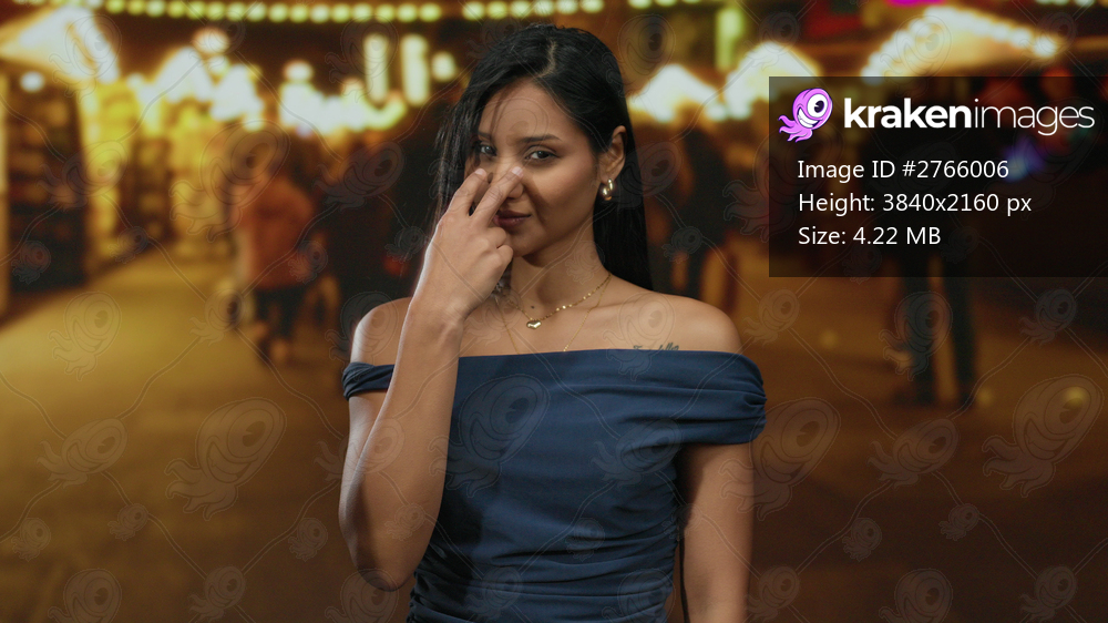 Woman gesturing vigilant sign in a busy outdoor market setting lit by warm lights in the evening, wearing elegant dress and jewelry, surrounded by blurred shoppers. - Kraken Images