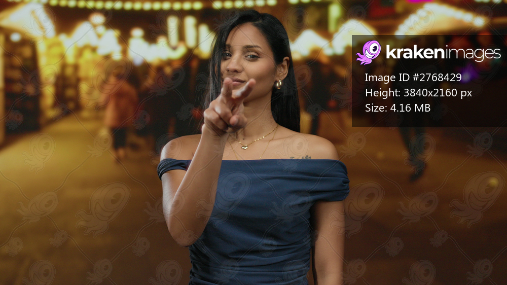 Woman gesturing vigilant sign in a busy outdoor market setting lit by warm lights in the evening, wearing elegant dress and jewelry, surrounded by blurred shoppers. - Kraken Images
