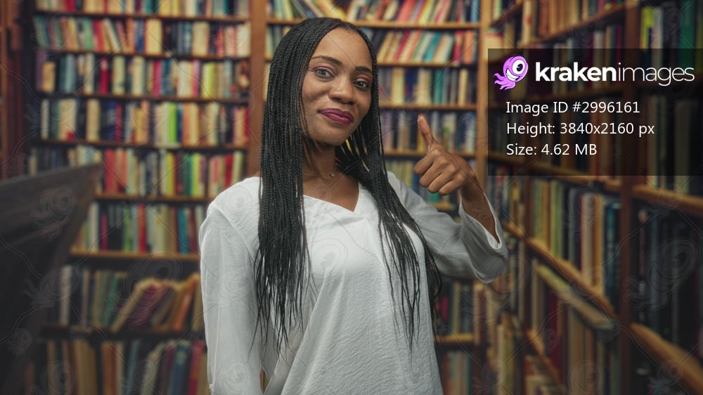 Woman gives thumbs up beside bookshelves in building, smiling with braided hair and white shirt; confidence learning success.