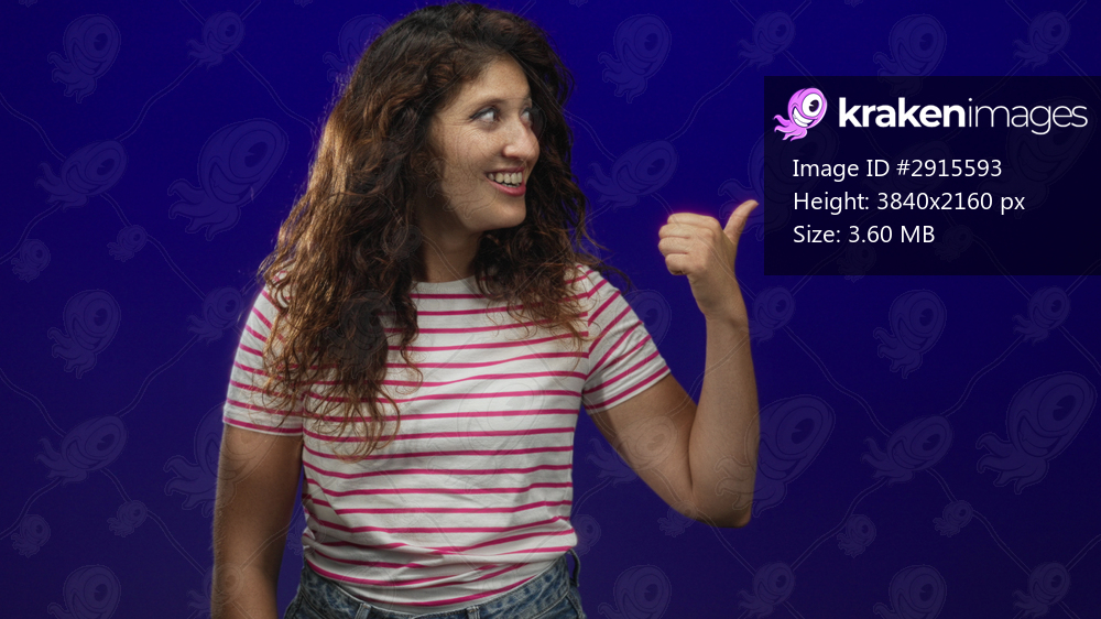 Woman gives thumbs up and smiles wearing striped tshirt and denim jeans in studio with deep purple backdrop; confidence positivity.