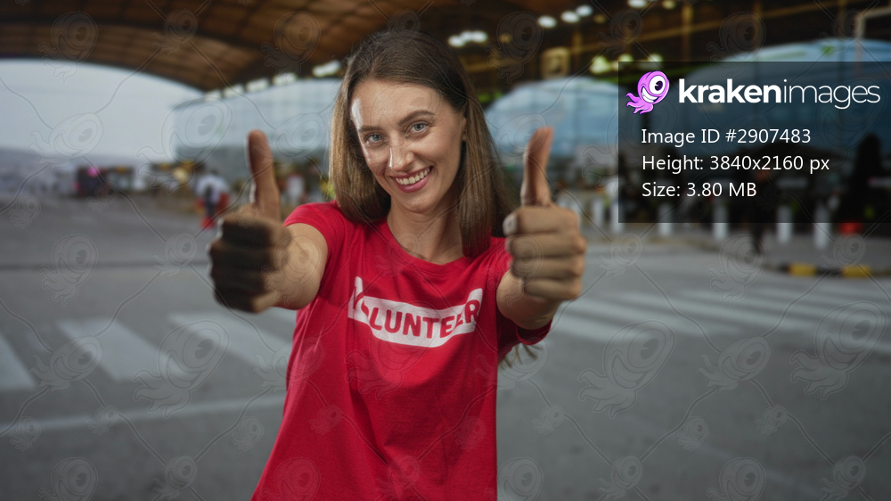 Woman giving double thumbs up in red volunteer t shirt at airport terminal crosswalk, smiling toward camera; optimism support.