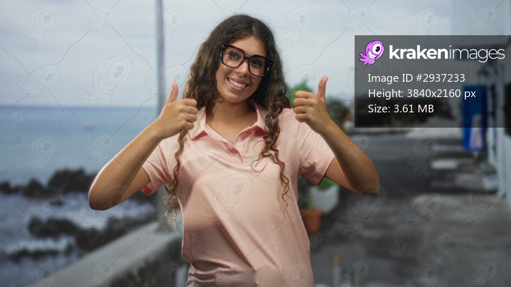 Woman giving double thumbs up with visible thumbs, smiling in a pink polo and glasses on a seaside street promenade by rocky waves and buildings; joy optimism. - Kraken Images