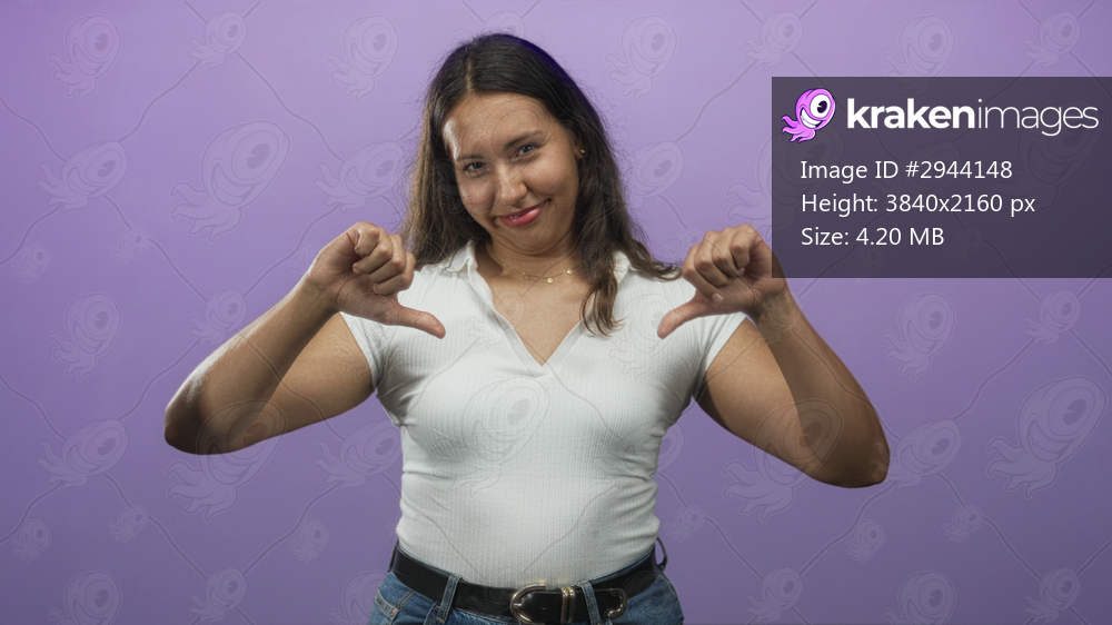 Woman giving thumbs down gesture with both thumbs visible, young hispanic woman in white shirt and jeans with belt against purple studio wall; disapproval. - Kraken Images