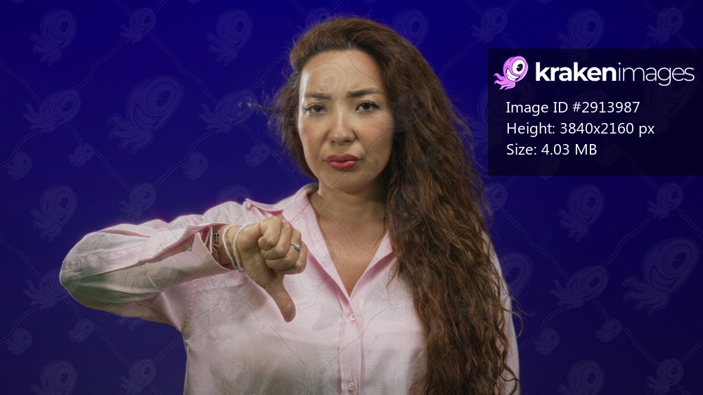 Woman giving thumbs down gesture in blue studio wearing pink shirt and bracelets, visible thumb and hand focus with direct gaze; disapproval.