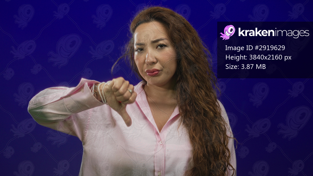 Woman giving thumbs down gesture in blue studio wearing pink shirt and bracelets, visible thumb and hand focus with direct gaze; disapproval.