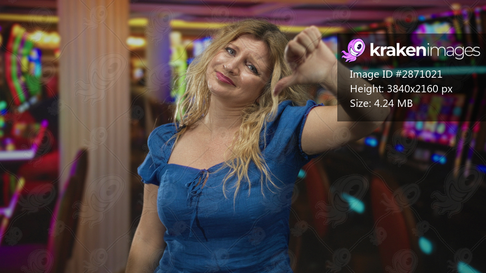 Woman giving thumbs down gesture inside casino building near slot machines and gaming chairs; disappointment bad luck.