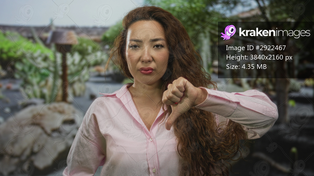 Woman giving thumbs down gesture with visible hand and long hair, wearing pink shirt in forest setting among green plants and stone path; disapproval.