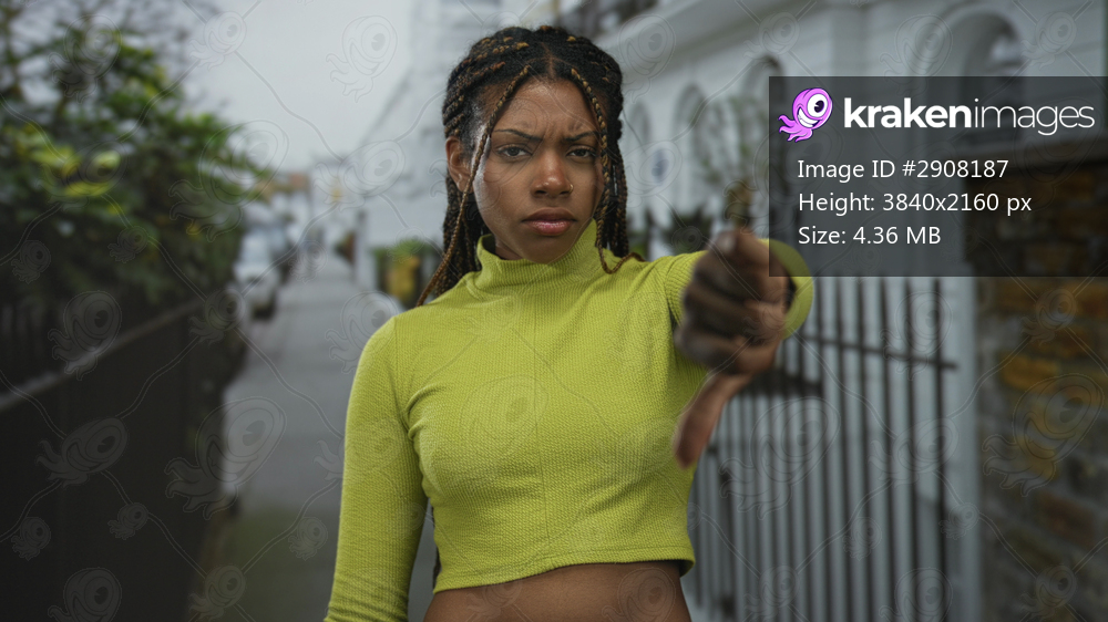 Woman giving thumbs down on a residential street wearing cropped lime green top, braided hair visible and stern expression; disapproval assertiveness.