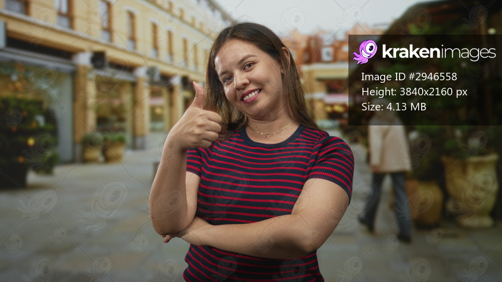 Woman giving thumbs up with arms crossed and smiling on a pedestrian street lined with shops; approval confidence.