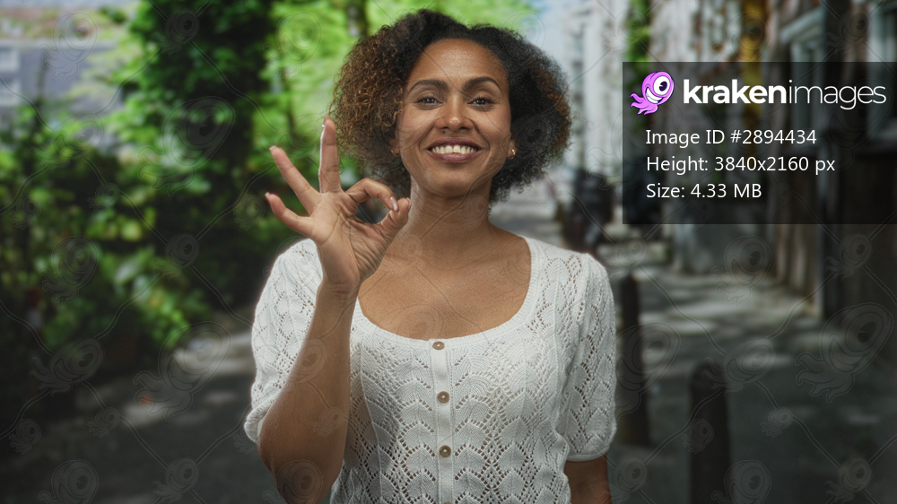 Woman giving thumbs up with both hands and points finger toward camera on sunlit street near buildings and greenery; joy approval.