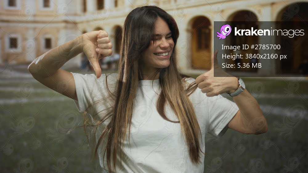 Woman giving thumbs up and down in front of historic university courtyard suggests mixed feelings or decision-making insights.
