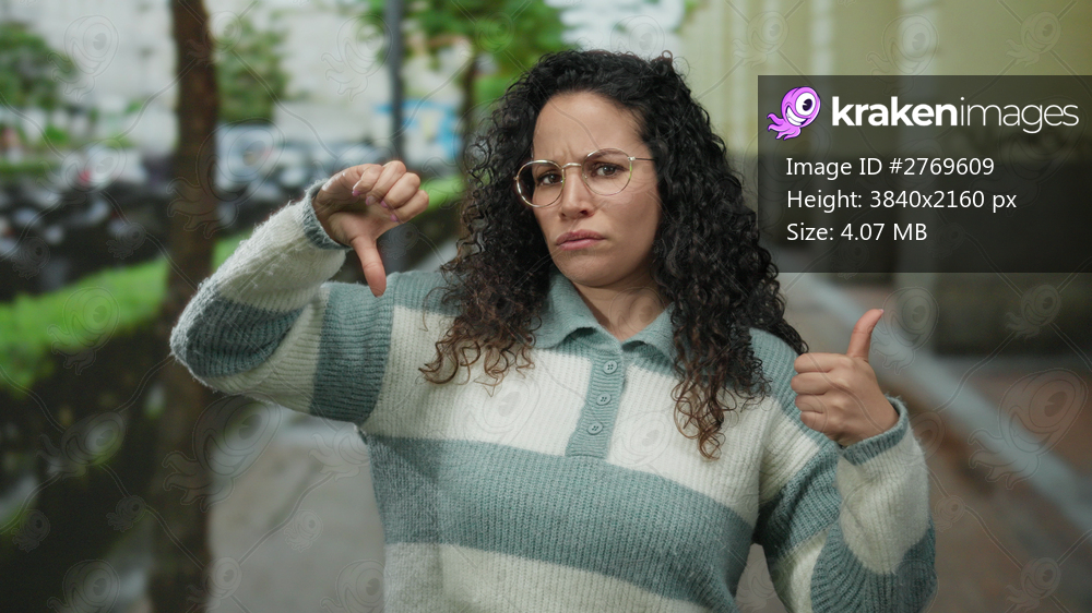 Woman giving thumbs up and down on city street wearing glasses and sweater with curly hair and smiling expression.