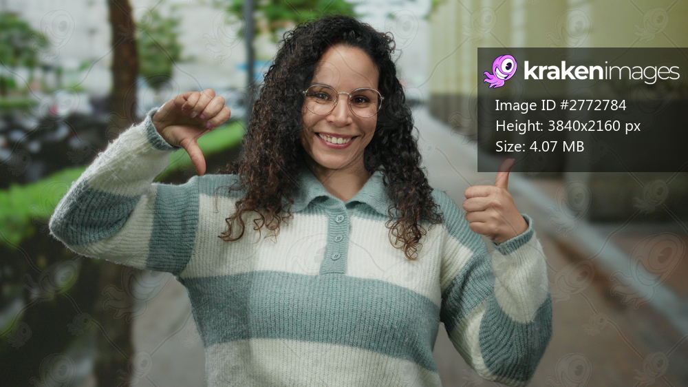 Woman giving thumbs up and down on city street wearing glasses and sweater with curly hair and smiling expression.