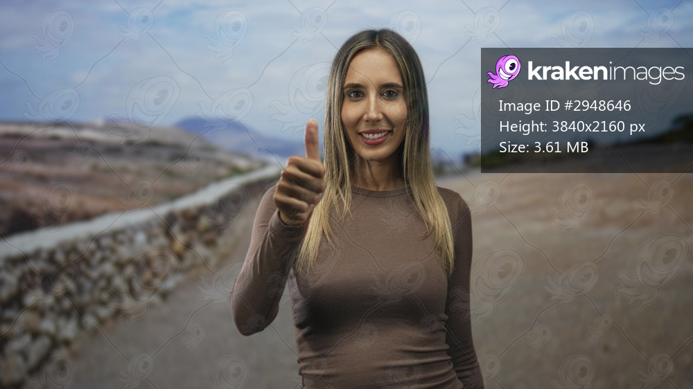 Woman giving thumbs up with extended thumb and smiling face on street by rocky path and distant hills; optimism encouragement.