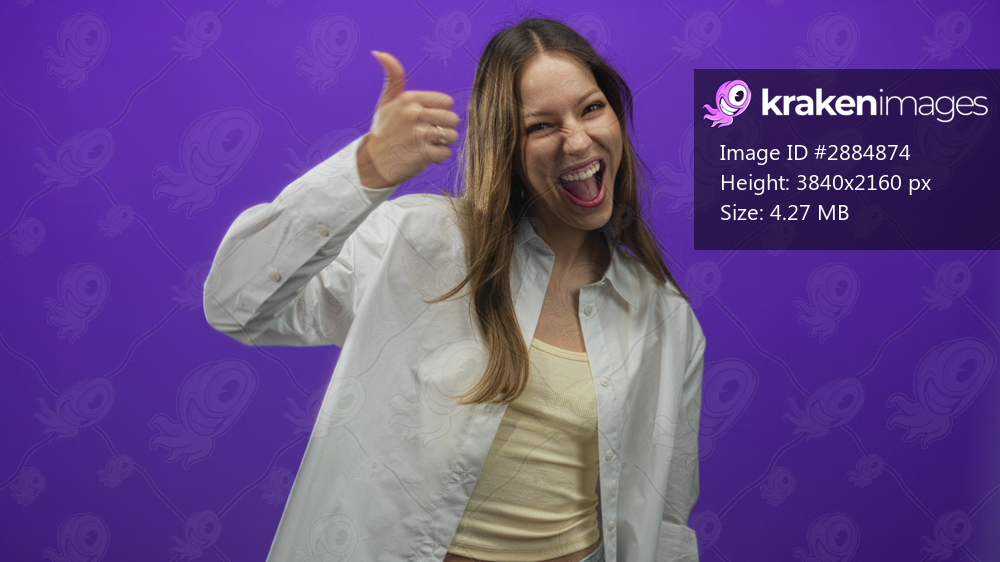 Woman giving thumbs up gesture, smiling with exposed thumbs and playful wink in purple studio; joy confidence optimism.
