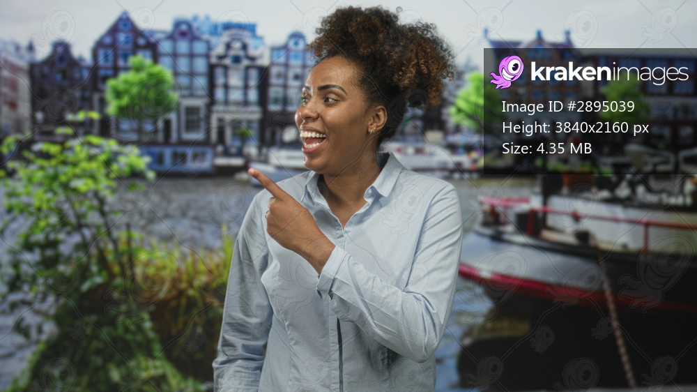 Woman giving thumbs up gesture with visible left hand and open smile on a street by amsterdam canal buildings and boats; joy optimism.