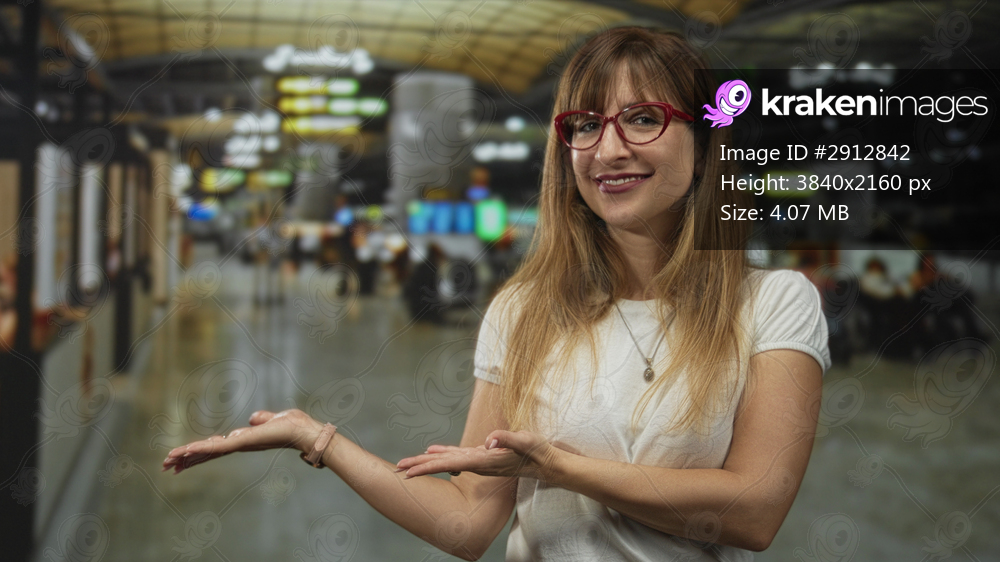 Woman giving thumbs up in a busy airport terminal wearing red glasses and white t shirt; travel confidence optimism.