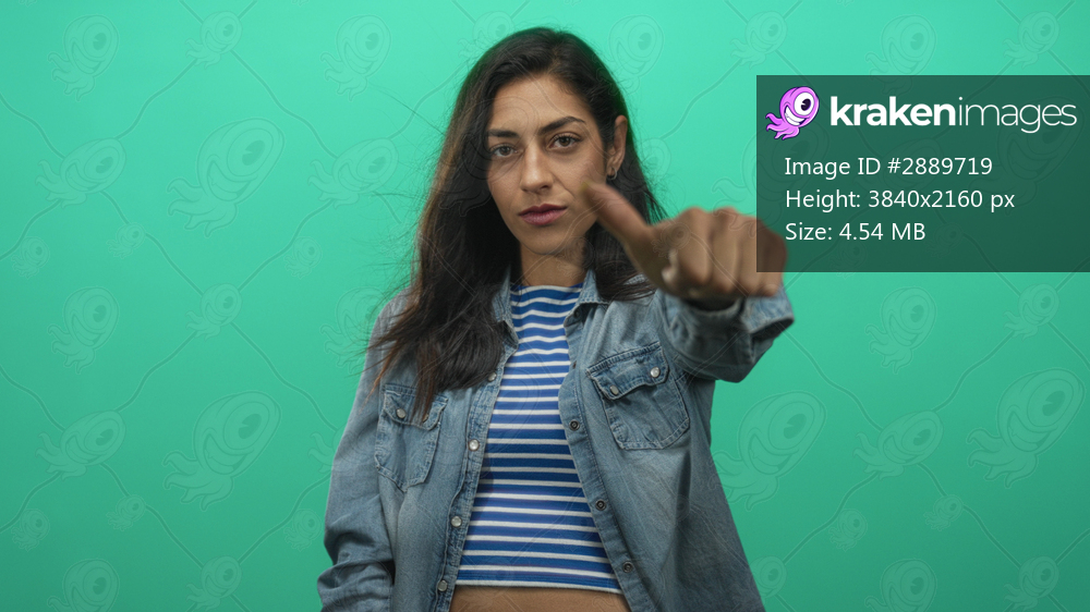 Woman giving thumbs up in studio with mint green wall, striped crop top and denim shirt smiling toward viewer; approval positivity.