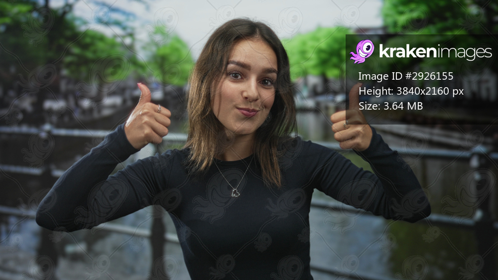 Woman giving thumbs up on amsterdam street, smiling toward camera with visible hands and thumbs; optimism celebration.