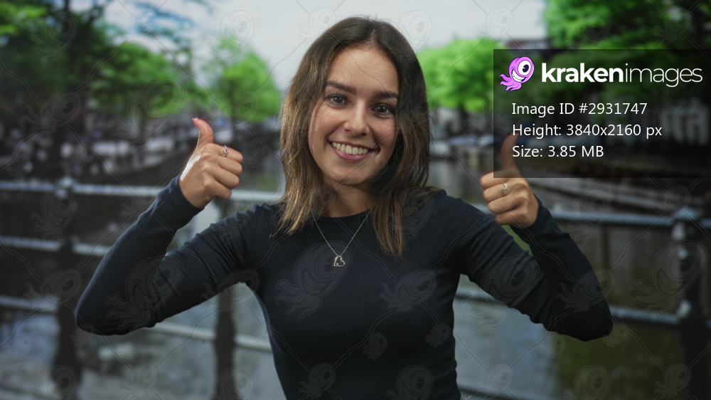 Woman giving thumbs up on amsterdam street, smiling toward camera with visible hands and thumbs; optimism celebration.