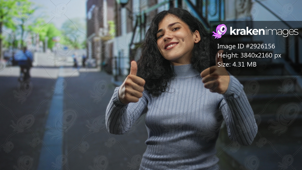 Woman giving thumbs up on city street by steps and sidewalk, smiling with eyes closed; confidence approval.