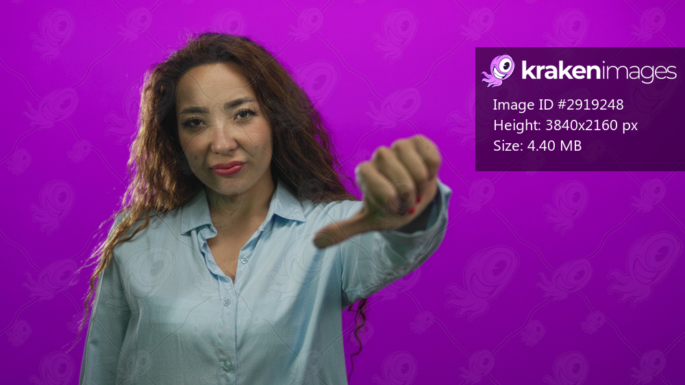Woman giving thumbs up with outstretched hand toward camera in studio purple backdrop; optimism encouragement.