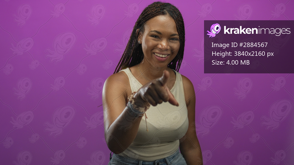 Woman giving thumbs up and pointing at camera, hands visible and braided hair, posing in purple studio; approval joy.