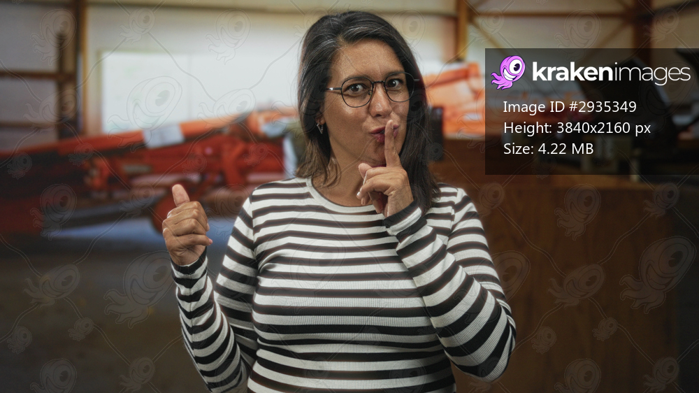 Woman giving thumbs up and pointing finger near mouth in a building hangar loaded with orange machinery and wearing glasses; playful reassurance.