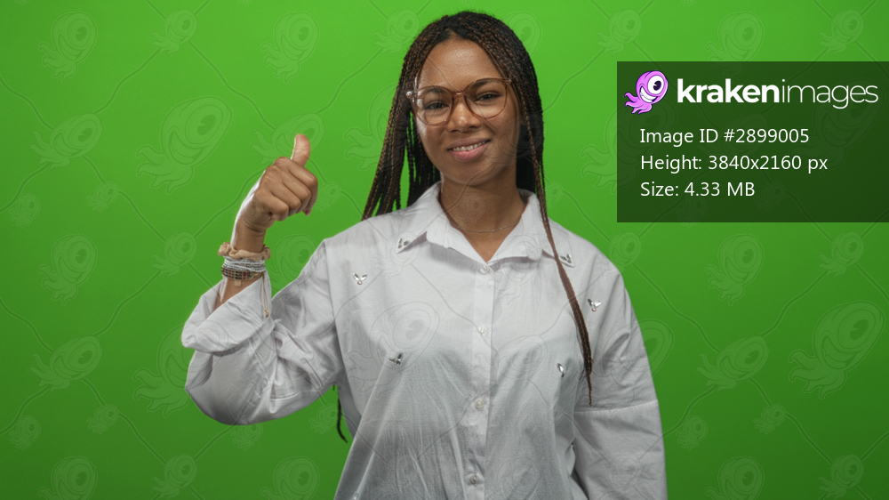 Woman giving thumbs up showing thumb and hand in studio with green backdrop; confidence approval encouragement.