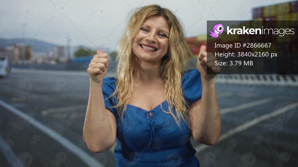 Woman giving thumbs up and smiling on a port street with colorful shipping containers and boats nearby; joy optimism celebration.