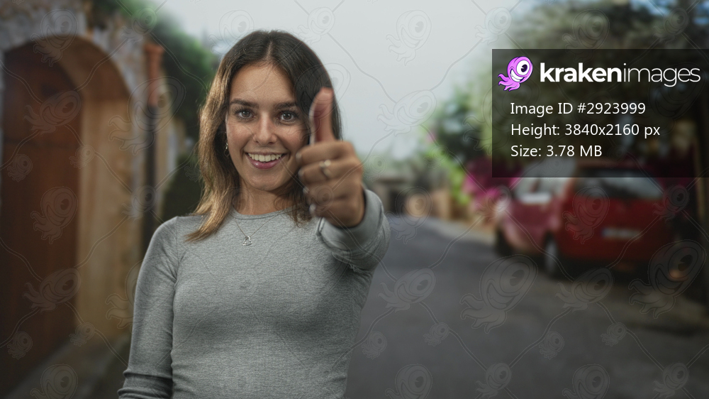 Woman giving thumbs up and smiling on a street with parked cars and stone arch building; approval support.