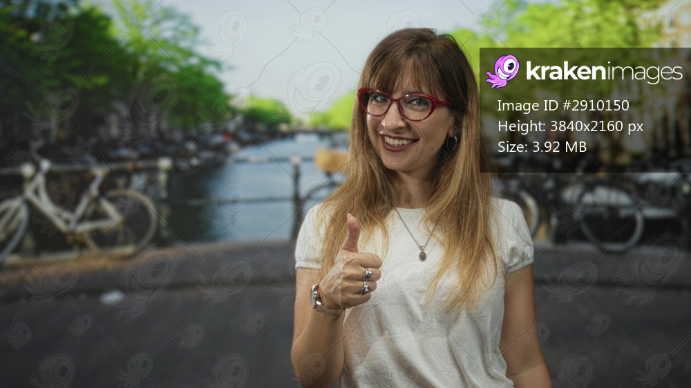Woman giving thumbs up and smiling on street in amsterdam by a canal with bicycles and bridge; positivity confidence.