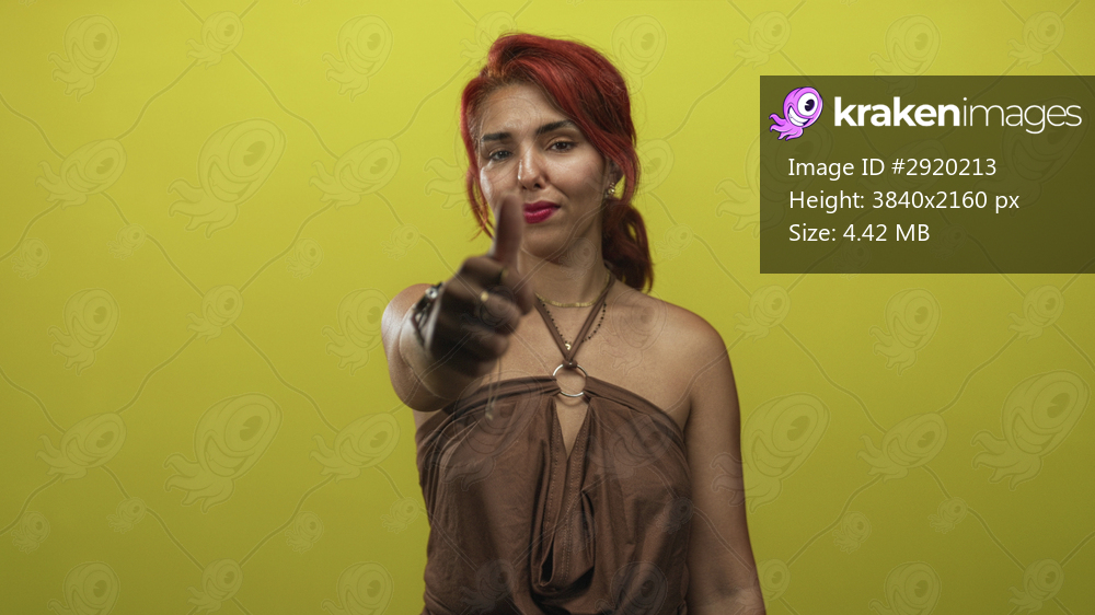 Woman giving thumbs up to camera in yellow studio, bare thumb visible; confidence approval support.