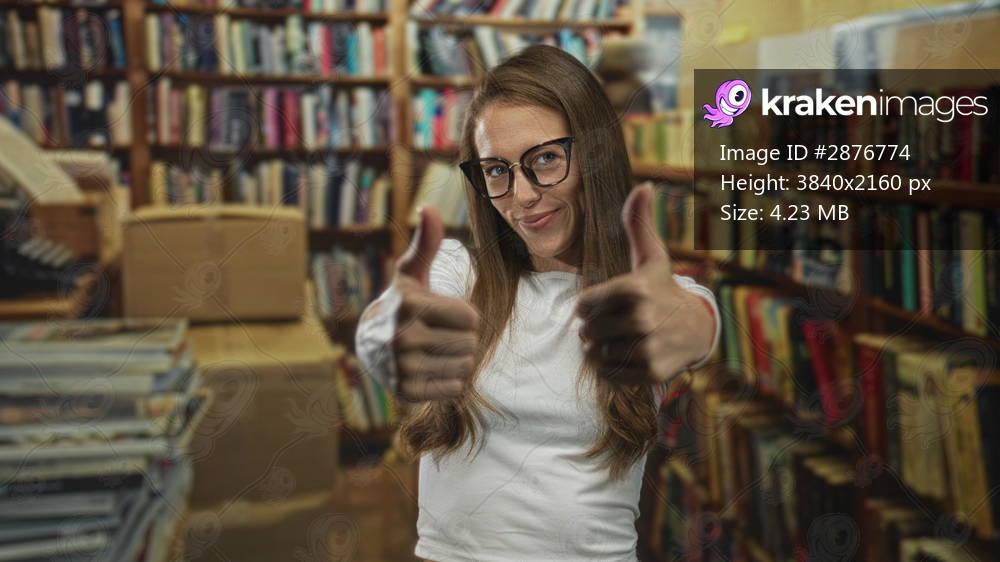 Woman giving thumbs up with visible thumb and smiling in a building library aisle; study motivation joy.