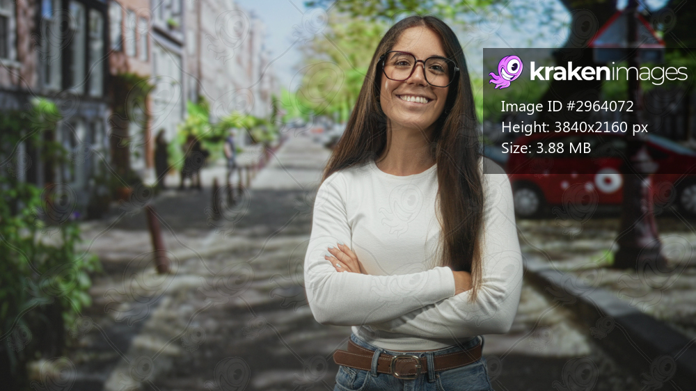 Woman giving thumbs up with visible thumb and smiling on a tree lined urban street by a red car and lamppost; optimism approval.