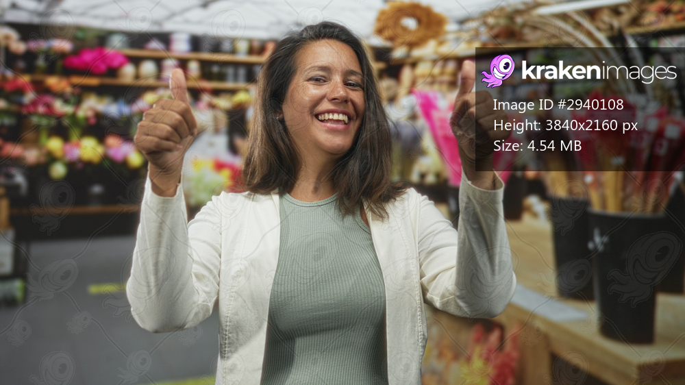 Woman giving thumbs up with visible thumbs and buckets of flowers on store shelves inside a building; approval.