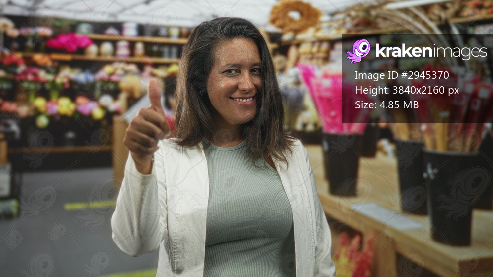 Woman giving thumbs up with visible thumbs and buckets of flowers on store shelves inside a building; approval.