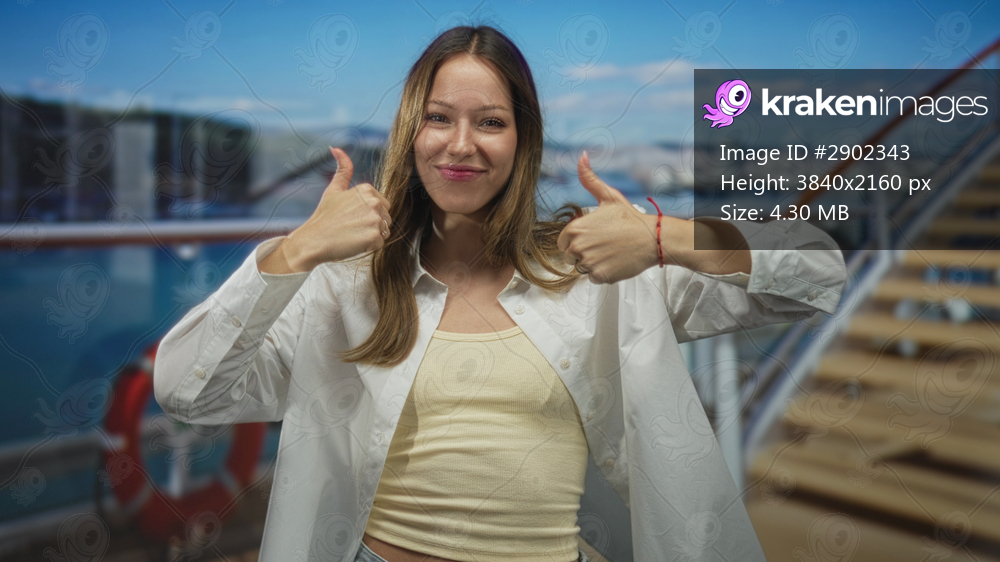 Woman giving two thumbs up on cruise ship deck by building and lifebuoy, wearing open white shirt and tank top, smiling at camera; vacation joy.