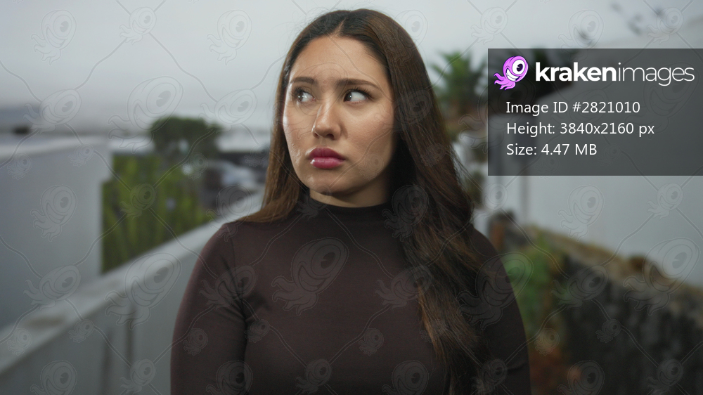 Woman glances sideways showing bare face and soft long hair beside white building facade; uncertainty.