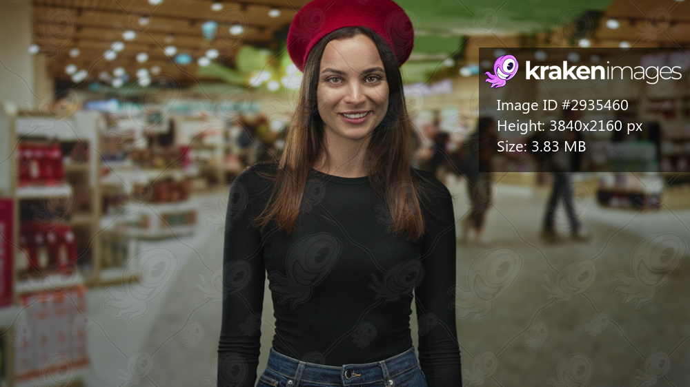 Woman glances up with a smirk, face visible, wearing a red beret and denim jeans in an airport terminal shop near shelves and displays; amused curiosity. - Kraken Images