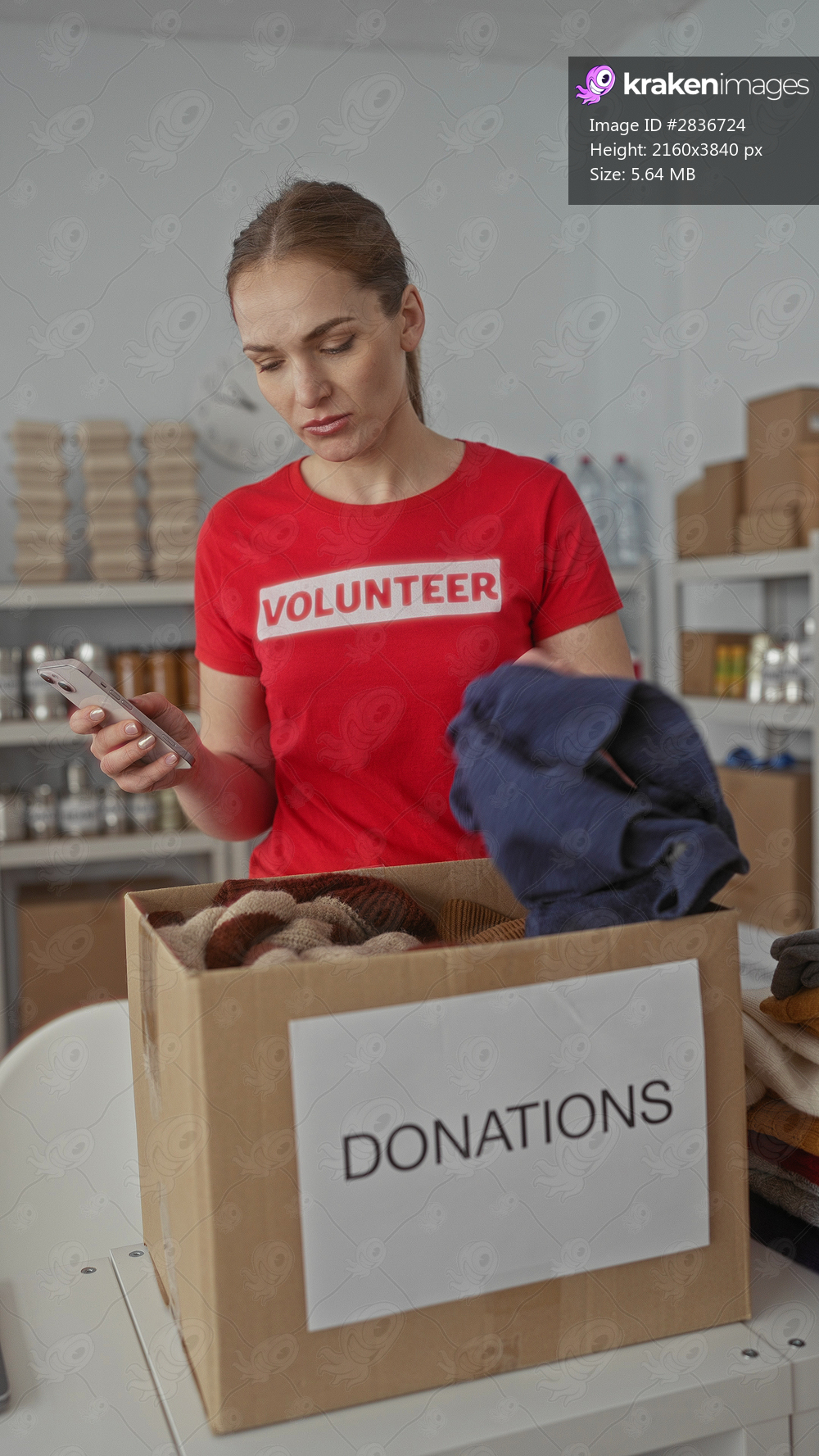 Woman glancing at smartphone while sorting donations in a box inside a building; compassion charity community service.