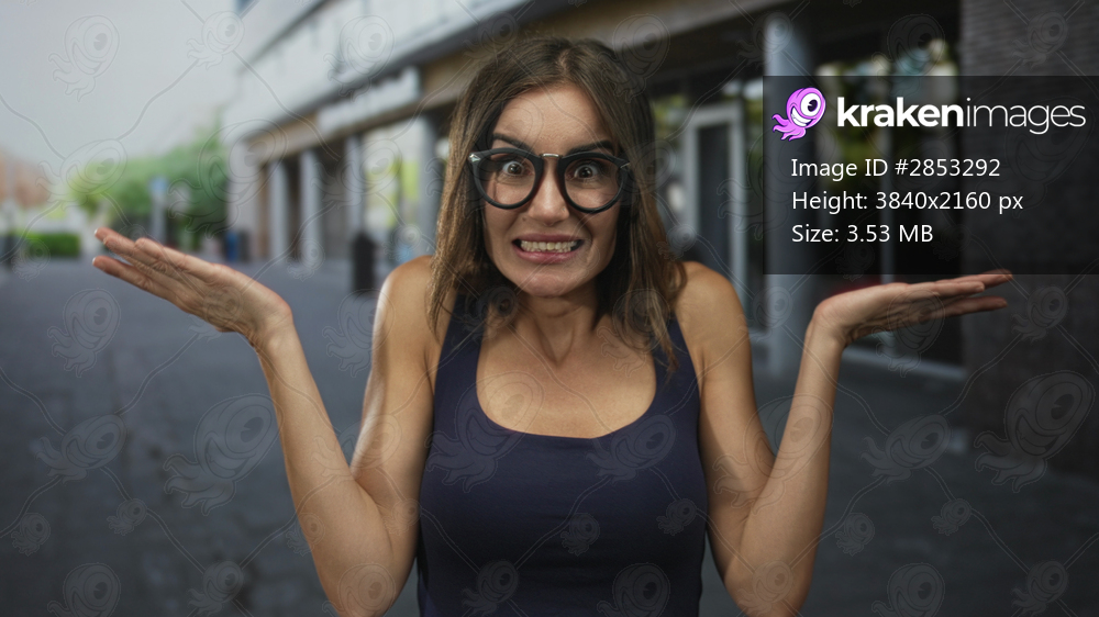 Woman with glasses biting her finger and raising her shoulders in front of a brick building on a paved street; confusion.