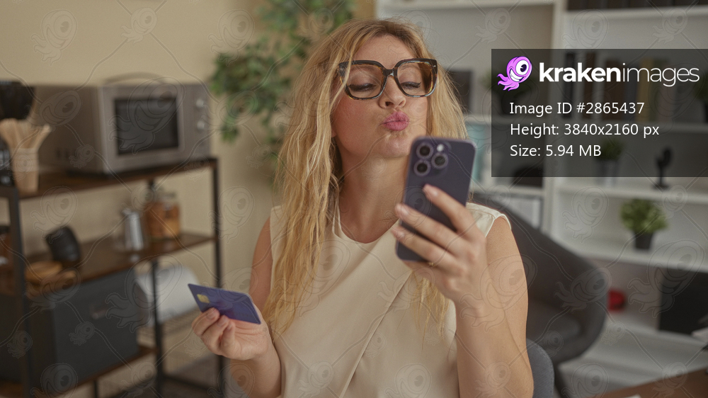 Woman with glasses and blonde hair holding a smartphone and creditcard, looking at the phone screen and tapping to pay while seated at a desk in an office building; financial focus. - Kraken Images