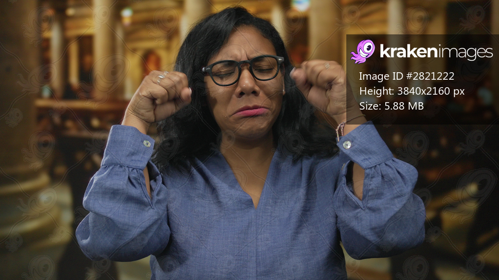 Woman with glasses and blue shirt raising clenched fists in a church interior with visible tears; sorrow.