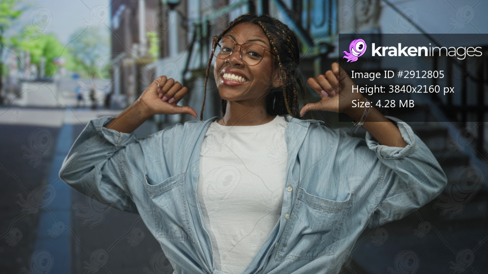 Woman with glasses and braided hair, thumbs pointing to chest on a city street by stone staircase; confidence pride.