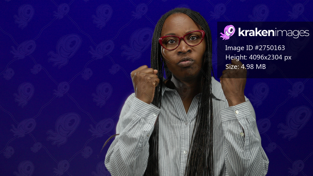 Woman with glasses and braids expressing anger with clenched fists against blue wall background, showcasing emotion and strength.