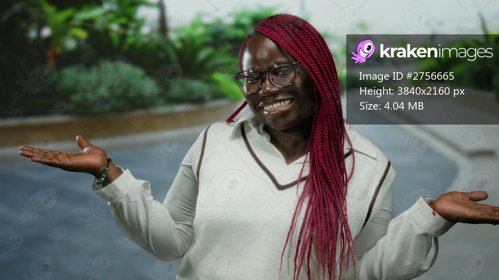 Woman with glasses and braids smiling with open arms on a city street, showcasing urban style and positive outdoor expression.